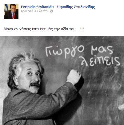 Ο βουλευτής Ροδόπης στην προσωπική σελίδα του στο Facebook με διάθεση χιούμορ, ανέβασε μια παραποιημένη εικόνα με τον Άλμπερτ Αϊνστάιν, στην οποία ο διάσημος φυσικός γράφει σε έναν πίνακα «Γιώργο μας λείπεις».