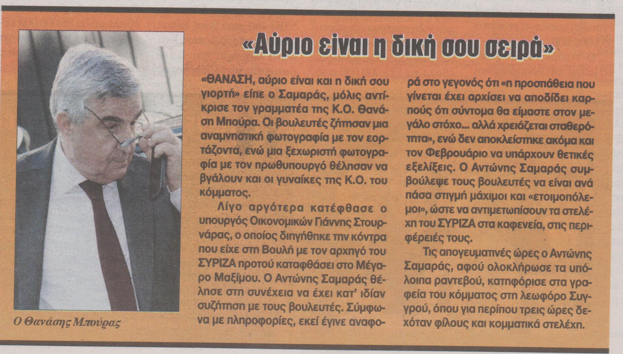Την περασμένη Παρασκευή ο κ. Σαμαράς βρισκόταν από νωρίς στο Μέγαρο Μαξίμου, καθώς είχε προγραμματίσει τα ραντεβού του, παρά τη γιορτή του. Για εκείνον φυσικά ήταν μία ημέρα δουλειάς.