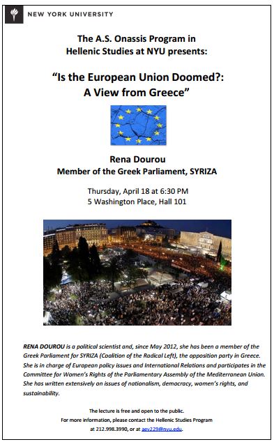 Σε φοιτητές της Σχολής Γούντροου Γουίλσον στο Πανεπιστήμιο Πρίνστον καθώς και σε ανοικτή εκδήλωση που διοργάνωσε το Πανεπιστήμιο της Νέας Υόρκης, μίλησε στις 17 και 18 Απριλίου, αντιστοίχως, η βουλευτής του ΣΥΡΙΖΑ, Ρένα Δούρου, με θέμα: «Είναι η Ευρώπη καταδικασμένη; Μια άποψη από την Ελλάδα».