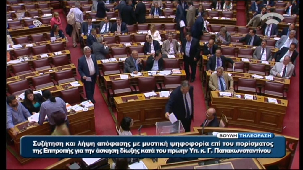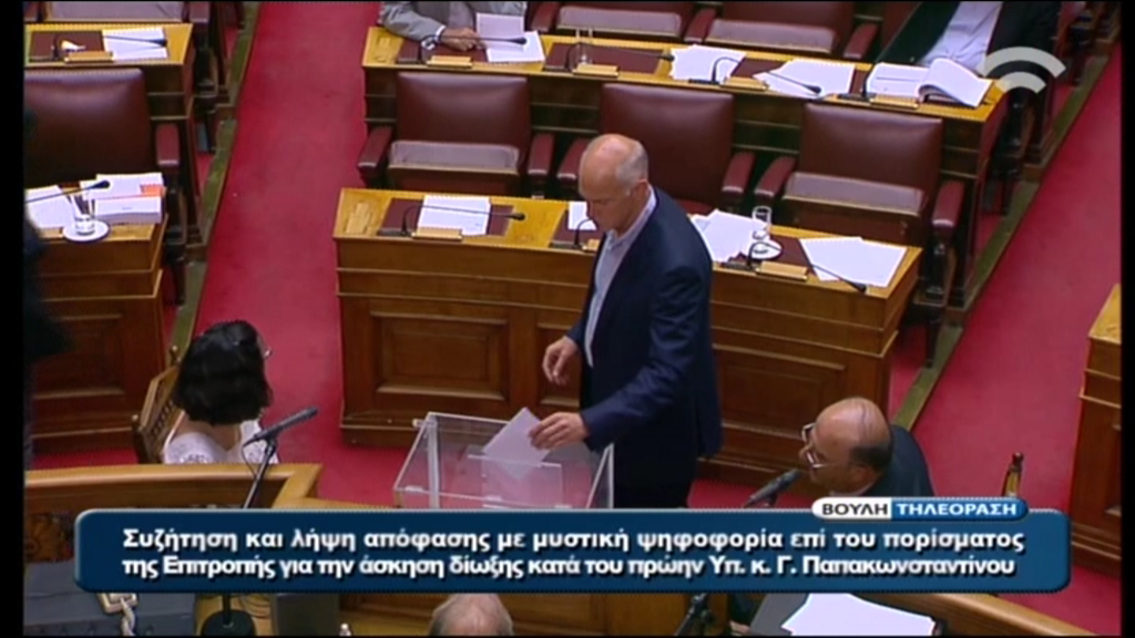 Η στιγμή που ο πρώην Πρωθυπουργός, Γιώργος Παπανδρέου και ο πρόεδρος του ΠΑΣΟΚ, Ευάγγελος Βενιζέλος, ψηφίζουν στην κάλπη της Βουλής για την παραπομπή του πρώην υπουργού Γιώργου Παπακωνσταντίνου.