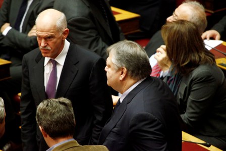 Παρών στη Βουλή και ο Γιώργος Παπανδρέου που ήταν κοντά στον πρόεδρο του ΠΑΣΟΚ, Ευάγγελο Βενιζέλο.