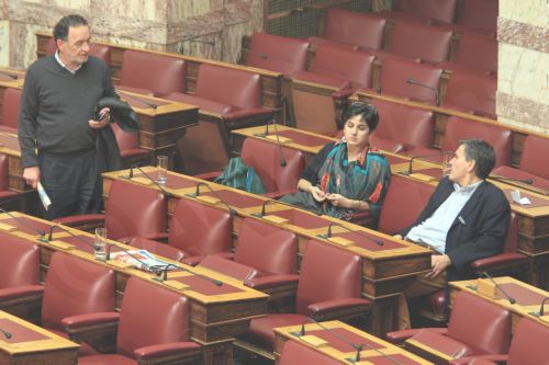 Την ίδια στιγμή, σε άλλη φωτογραφία, απεικονίζονται οι βουλευτές του ΣΥΡΙΖΑ Παναγιώτης Λαφαζάνης , Ηρώ Διώτη και Ευκλείδης Τσακαλώτος να συνομιλούν στα έδρανα της βουλής.