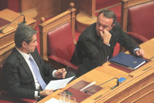 Σε εξέλιξη βρίσκεται στην Ολομέλεια της Βουλής η τελευταία ημέρα για την ψήφιση του Προϋπολογισμού 2015 και όπως φαίνεται στις φωτογραφίες ο υπουργός Παιδείας, Ανδρέας Λοβέρδος συνομίλησε με τον αναπληρωτή υπουργό Οικονομικών Χρήστο Σταϊκούρα.