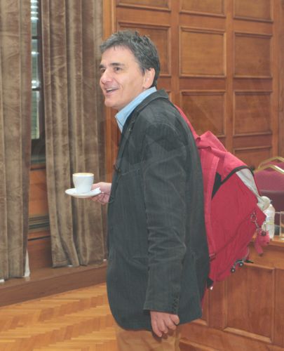 Με casual ντύσιμο, τον καφέ στο χέρι και χαμογελαστός ο βουλευτής του ΣΥΡΙΖΑ Ευκλείδης Τσακαλώτος φθάνει σε συνεδρίαση επιτροπής της Βουλής. Ο κ. Τσακαλώτος έχει στην πλάτη του έναν κόκκινο αθλητικό σάκο, που πηγαίνει με την απλότητά του.