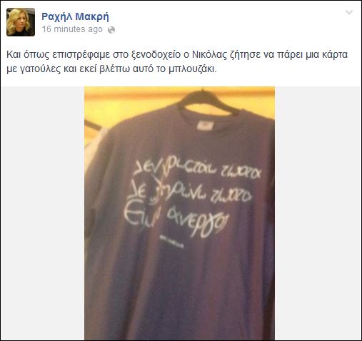 Ένα μήνυμα τυπωμένο σε μπλουζάκι κέντρισε το ενδιαφέρον της Ραχήλ Μακρή σε κατάστημα τουριστικών ειδών στην Ικαρία, όπου απολαμβάνει τις διακοπές της με την οικογένεια της. Η κοινοβουλευτική εκπρόσωπος των Ανεξάρτητων Ελλήνων ανέβασε φωτογραφία στον προσωπικό της λογαριασμό στο Facebook με το «επίμαχο» μπλουζάκι το οποίο έγραφε, «δεν χρωστάω τίποτα, δεν πληρώνω τίποτα, είμαι άνεργος» παραφρασμένο από την γνωστή ρήση του Νίκου Καζαντζάκη.