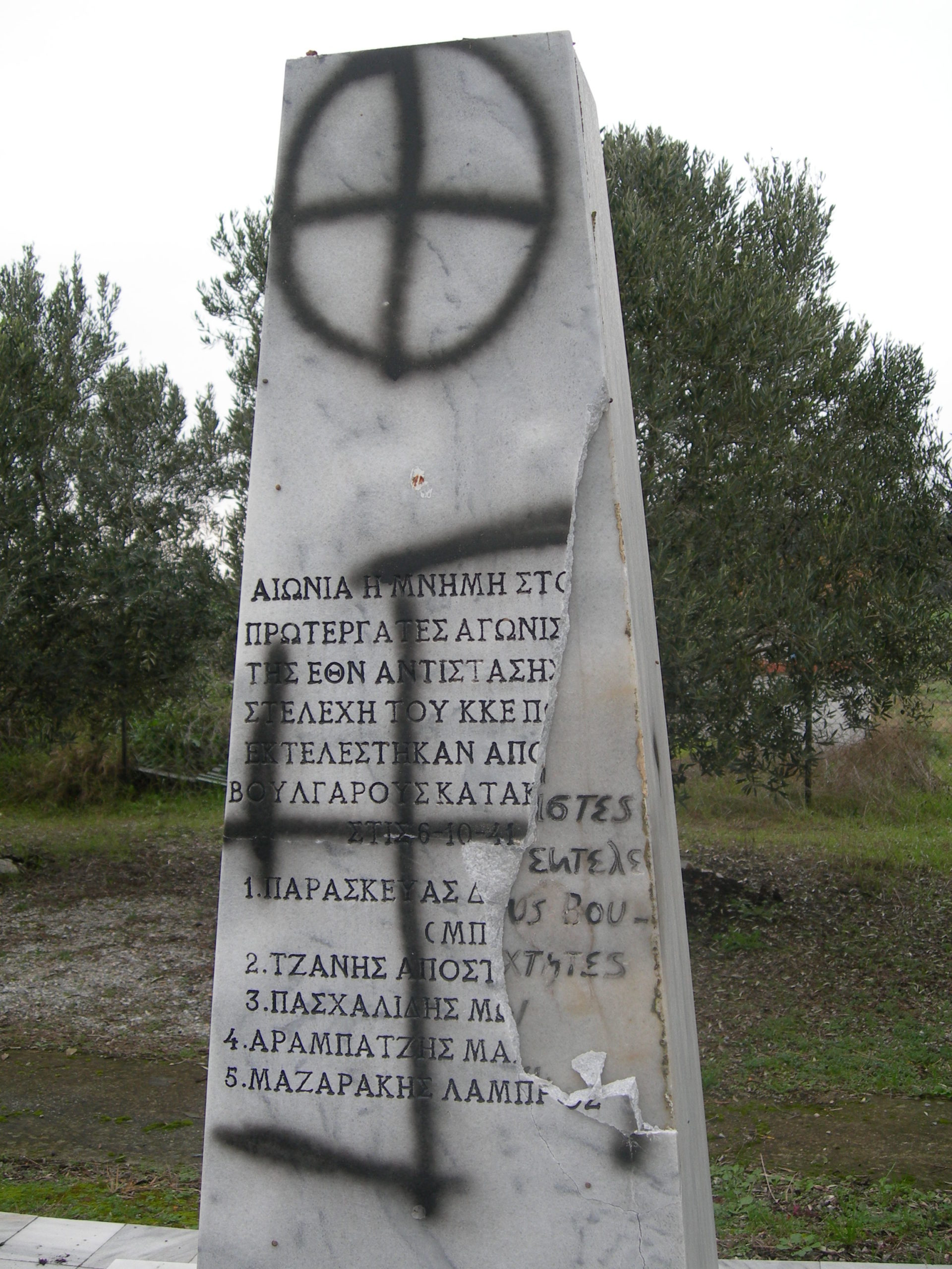«Η Τ.Ε. Σερρών του ΚΚΕ καταγγέλλει τον βανδαλισμό του μνημείου προς τιμή των μελών του Μακεδονικού Γραφείου του ΚΚΕ που δολοφονήθηκαν από τους Βούλγαρους φασίστες κατακτητές στις 6 Οκτώβρη του 1941 στην προσπάθειά τους να οργανώσουν την Αντίσταση στην περιοχή, στην Παλαιοκώμη – Μεσολακκιά Σερρών, από φασιστοειδή της Χρυσής Αυγής.