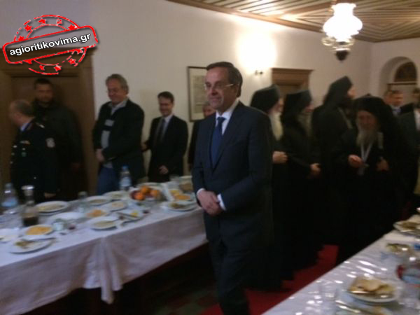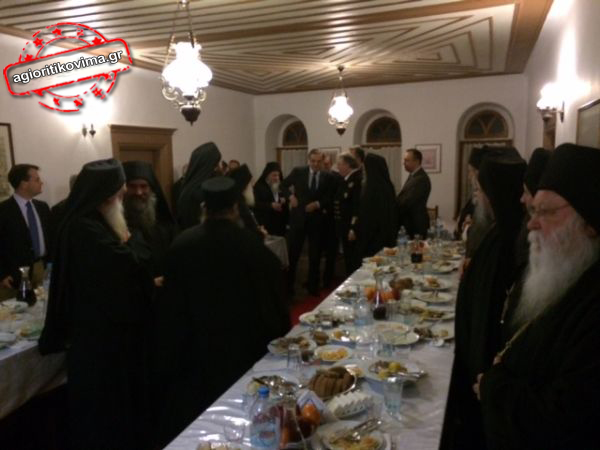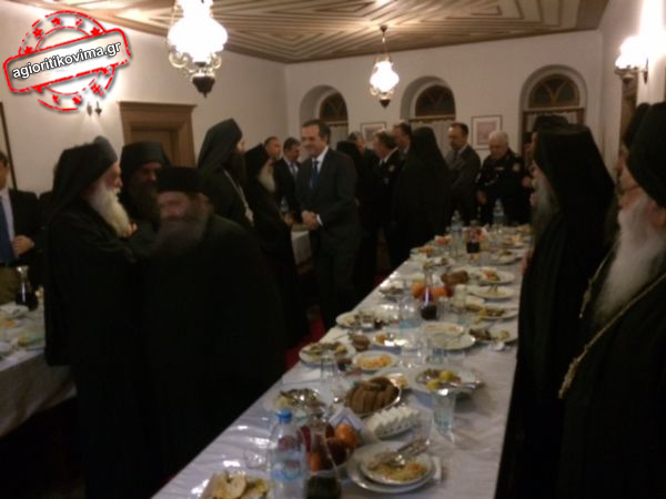 Αγιορείτικη ψαρόσουπα, ψητό ψάρι ξιφία, τυρί φέτα και αγιορείτικο κόκκινο κράσι περιελάμβανε το μενού του δείπνου για τον Πρωθυπουργό, Αντώνη Σαμαρά, κατά την πρώτη ημέρα της επίσκεψής του στο περιβόλι της Παναγίας.