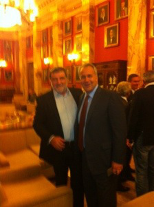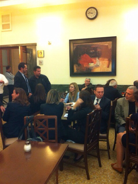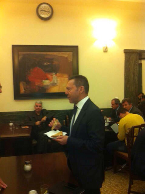 Με το τοστ στο χέρι ο υπουργός οικονομικών Γιάννης Στουρνάρας μόλις έχει ολοκληρώσει την ομιλία του στη βουλή και μαζί με στενούς του συνεργάτες κάθεται για λίγο στο εντευκτήριο της βουλής.