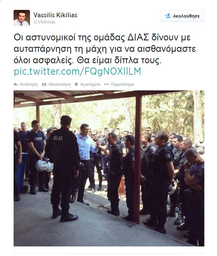 Αν και η συμμετοχή του υπουργού δεν καταγράφηκε από τους φωτογραφικούς φακούς, ο ίδιος ανάρτησε μια φωτογραφία στο twitter που μιλά με τους άντρες της ομάδας ΔΙΑΣ.