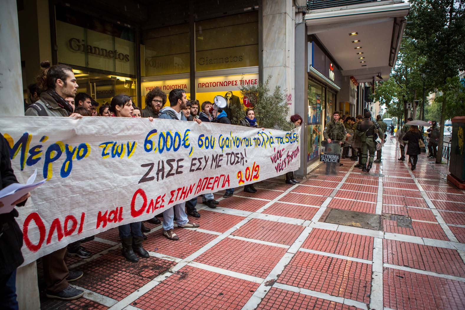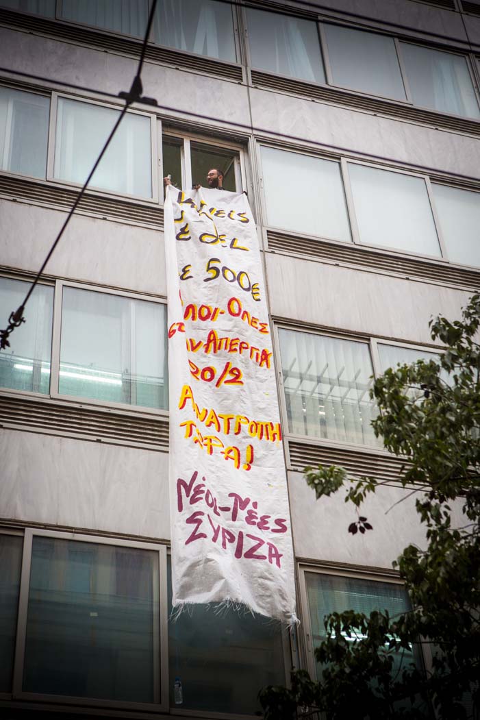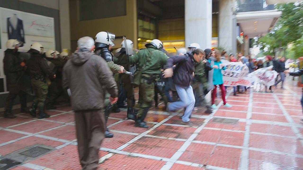 Στις φωτογραφίες που έστειλε το γραφείο Τύπου του ΣΥΡΙΖΑ,φαίνεται η βίαιη επέμβαση των ΜΑΤ εναντίον των διαδηλωτών μετά την συμβολική κατάληψη του γραφείου του Γενικού Γραμματέα του ΥΠΟΙΚ, Γιώργου Μέργου.