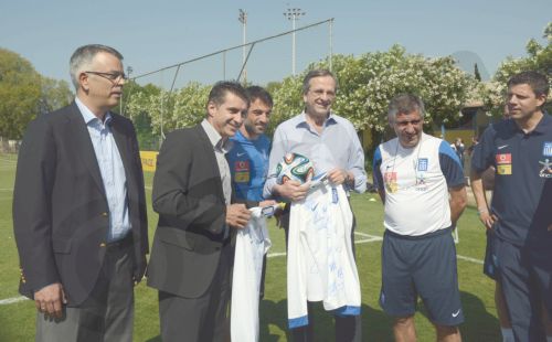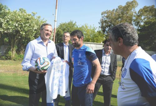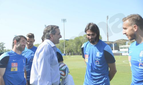 Στις αθλητικές εγκαταστάσεις του Αγίου Κοσμά, βρέθηκε σήμερα, ο Αντώνης Σαμαράς, προκειμένου να ευχηθεί καλή επιτυχία στους παίκτες της εθνικής ομάδας ποδοσφαίρου. Όπως φαίνεται και στις φωτογραφίες ο πρωθυπουργός συνομίλησε με τον προπονητή της εθνικής, Φερνάντο Σάντος, ενώ ο αρχηγός, Γιώργος Καραγκούνης, πρόσφερε στον Αντώνη Σαμαρά μια φανέλα και μία μπάλα του Μουντιάλ με τις υπογραφές όλων των ποδοσφαιριστών.