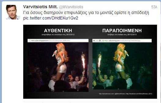 Μάλιστα, με αφορμή παραποιημένη φωτογραφία που κυκλοφόρησε χθες στο διαδίκτυο και απεικόνιζε τον ίδιο, ο κ. Βαρβιτσιώτης ξεκαθάρισε ότι για τα συγκεκριμένα δημοσιεύματα θα προχωρήσει σε αγωγές και μηνύσεις. Πριν από λίγο, άλλωστε, μέσω του προσωπικού του λογαριασμού στο tweeter ανάρτησε την πραγματική φωτογραφία αντιπαραβάλλοντάς τη με την παραποιημένη που βγήκε χθες στη δημοσιότητα, γράφοντας: “Για όσους διατηρούν επιφυλάξεις για το μοντάζ, ορίστε η απόδειξη”