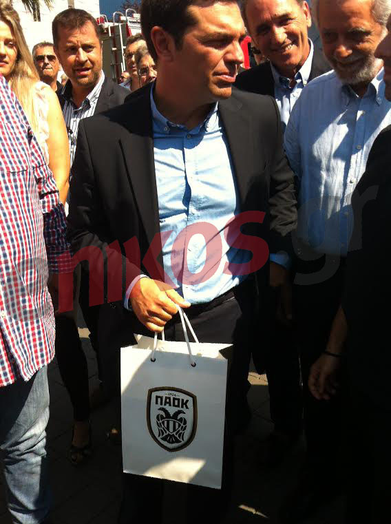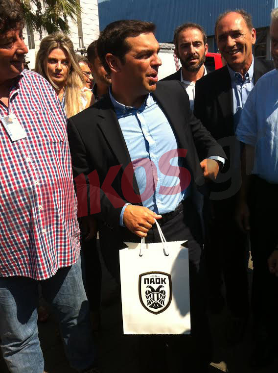 Χάρισαν μια στον ίδιο και μια στο παιδί του και τον ρώτησαν αν θα τη φορέσει. Με χαμόγελο, ο Αλέξης Τσίπρας, τους είπε ότι «στα ευρωπαϊκά παιχνίδια σας υποστηρίζω. Πάνω από τη Λάρισα, είχα πει ότι είμαι ΠΑΟΚ αλλά μου την έπεφταν οι σύντροφοι που ήταν οπαδοί του Άρη και σταμάτησα να το λέω».