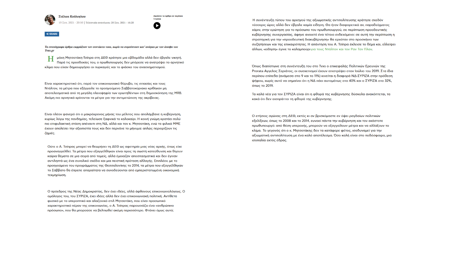 Ταυτόχρονα, και ενώ ο ΣΥΡΙΖΑ – ΠΣ είχε εμφανιστεί στη ΔΕΘ με μια συγκροτημένη πρόταση αντιμέτωπος όχι μόνο με την πολιτική της Κυβέρνησης Μητσοτάκη, αλλά και με μια έντονη μιντιακή «δυσανεξία», ο Στέλιος Κούλογλου μίλησε για «ισοπαλία» Μητσοτάκη-Τσίπρα, εμφανιζόμενος σε ρόλο δημοσιογράφου – σχολιαστή και όχι ως συστατικό μέρος ενός πολιτικού συνόλου, με συγκεκριμένο στόχο και σημαντικές συλλογικές μάχες να κερδίσει. Ήταν μια ακόμη κρίσιμη παρέμβαση που αποδυνάμωσε συνολικά την παρέμβαση του ΣΥΡΙΖΑ – ΠΣ στη ΔΕΘ, δημιουργώντας εμπόδια στην προσπάθεια συνομιλίας του με την κοινωνία και ενδυνάμωσης της αξιοπιστίας του.