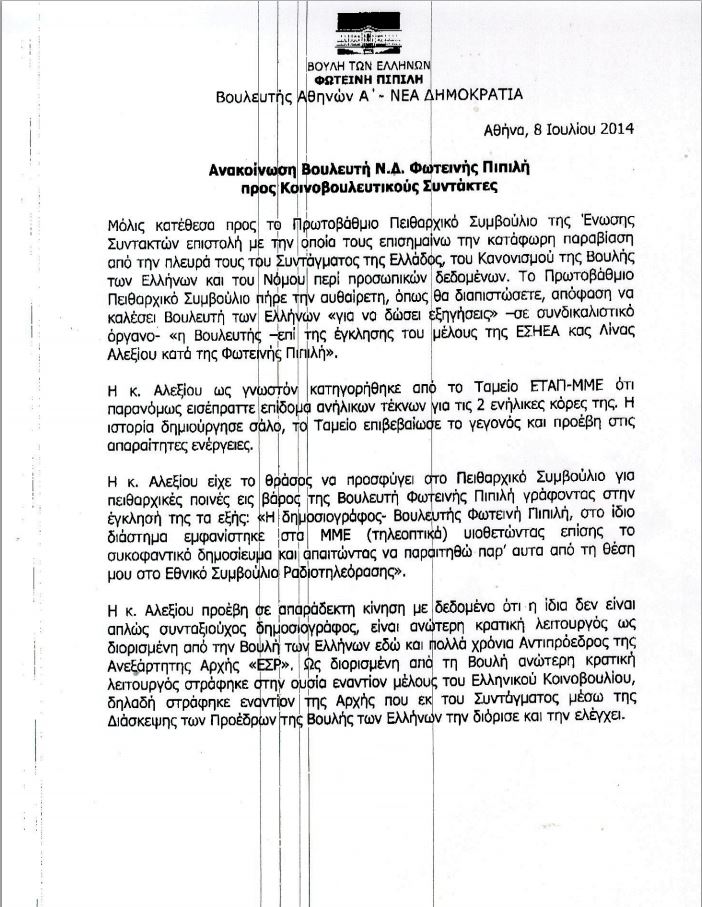 Επιστολή προς το Πρωτοβάθμιο Πειθαρχικό Συμβούλιο της Ένωσης Συντακτών έστειλε η βουλευτής της ΝΔ Φωτεινή Πιπιλή, επισημαίνοντας την «κατάφωρη παραβίαση», από την πλευρά τους, του Συντάγματος, του Κανονισμού της Βουλής και του νόμου περί προσωπικών δεδομένων.