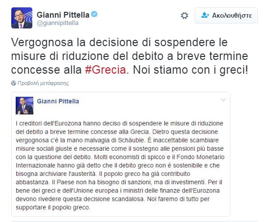 Εξοργισμένοι με την απόφαση του Eurogroup να αναστείλει τα βραχυπρόθεσμα μέτρα ελάφρυνσης του χρέους που χορηγήθηκαν στην Ελλάδα εμφανίζονται οι ευρωβουλευτές των Σοσιαλιστων και Δημοκρατών. Ο πρόεδρος τους Τζιάνι Πιτέλα δήλωσε πως η απόφαση αυτή αποτελεί όνειδος και την απέδωσε στο “κακό χέρι του Σόιμπλε”.
