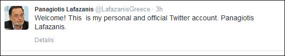 “Πρόκειται προφανώς, αναφέρει, περί κακόβουλης χρήσης του ονόματος, της φωτογραφίας και της ιδιότητας του υπουργού ΠΑΠΕΝ Π. Λαφαζάνη. Ο Π. Λαφαζάνης δεν διαθέτει κανέναν λογαριασμό στα μέσα κοινωνικής δικτύωσης και φυσικά ούτε στο twitter. Επομένως ουδεμία σχέση έχει ούτε με τον συγκεκριμένο λογαριασμό, ούτε με οποιονδήποτε άλλον και με το περιεχόμενό τους.”