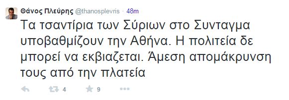 Ο Θάνος Πλεύρης με ανάρτησή του στο Twitter έκανε λόγο για “τσαντίρια” των Σύρων στο Σύνταγμα και μάλιστα ζήτησε την άμεση απομάκρυνσή τους καθώς “υποβαθμίζουν την Αθήνα”.
