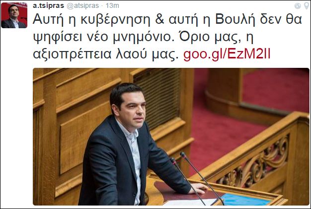 “Αυτή η κυβέρνηση και αυτή η Βουλή δεν θα ψηφίσει νέο μνημόνιο. Όριο μας, η αξιοπρέπεια του λαού μας” έγραψε χαρακτηριστικά ο Αλέξης Τσίπρας.