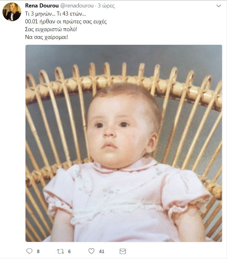 Ο λόγος για την Περιφερειάρχη Αττικής Ρένα Δούρου, η οποία έγραψε χαρακτηριστικά στην ανάρτησή της “Τι 3 μηνών… Τι 43 ετών… 00.01 ήρθαν οι πρώτες σας ευχές Σας ευχαριστώ πολύ! Να σας χαίρομαι!”, θέλοντας έτσι να ευχαριστήσει όσους της ευχήθηκαν.