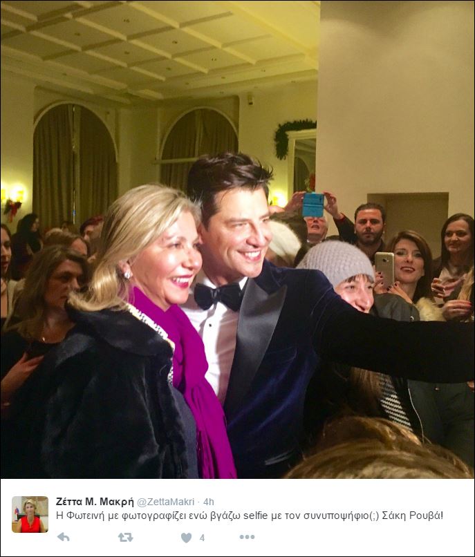 Εκεί, βρέθηκε και η πρώην υφυπουργός και πρώην βουλευτής της ΝΔ Ζέττα Μακρή η οποία έβγαλε selfie με τον γνωστό τραγουδιστή. Η κ. Μακρή ανέβασε τη φωτογραφία στο Twitter και έγραψε μια αινιγματική λεζάντα:
