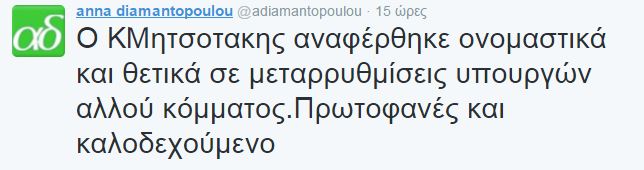 Σύμφωνα με όσα έγραψε η ίδια στο Twitter, η κυρία Διαμαντοπούλου, είδε με καλό μάτι το γεγονός ότι ο Κυριάκος Μητσοτάκης μίλησε θετικά για μεταρρυθμίσεις που έφεραν άλλα κόμματα.