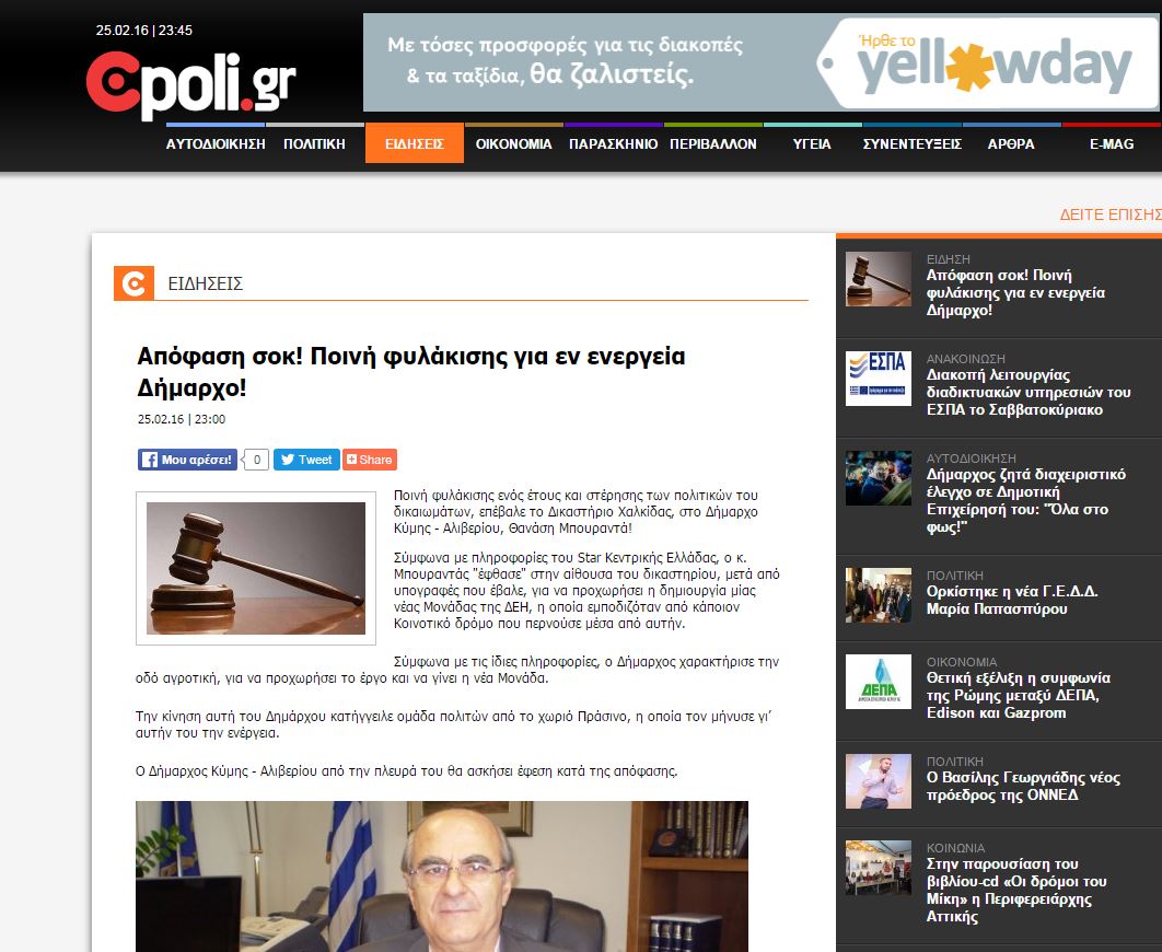 Ποινή φυλάκισης ενός έτους και στέρησης των πολιτικών του δικαιωμάτων, επέβαλε το δικαστήριο Χαλκίδας, στο δήμαρχο Κύμης – Αλιβερίου, Θανάση Μπουραντά.