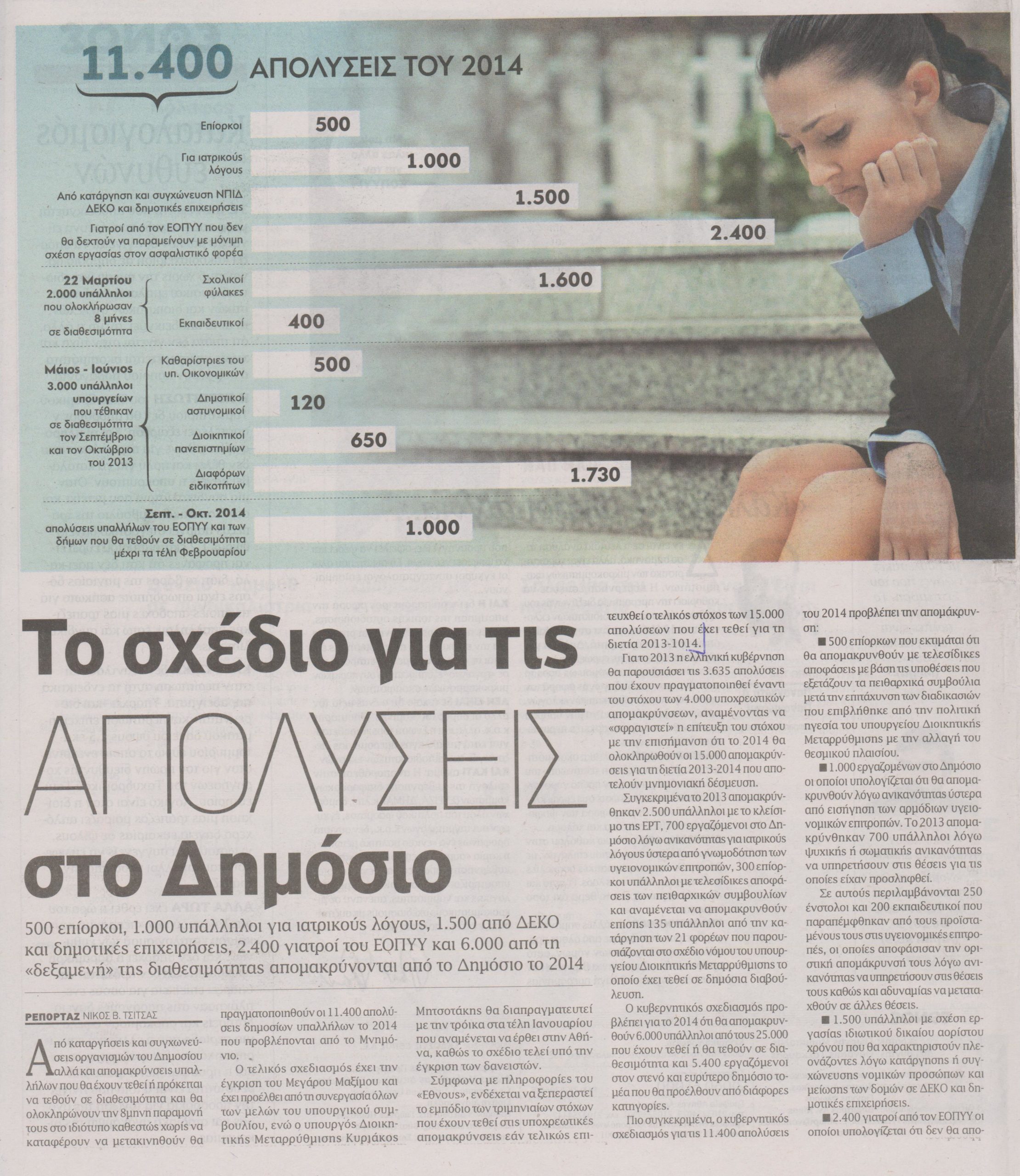 Από καταργήσεις και συγχωνεύσεις οργανισμών του Δημοσίου αλλά και απομακρύνσεις υπαλλήλων που θα έχουν τεθεί ή πρόκειται να τεθούν σε διαθεσιμότητα και θα ολοκληρώνουν την 8μηνη παραμονή τους στο ιδιότυπο καθεστώς χωρίς να καταφέρουν να μετακινηθούν θα πραγματοποιηθούν οι 11.400 απολύσεις δημοσίων υπαλλήλων το 2014 που προβλέπονται από το Μνημόνιο.
