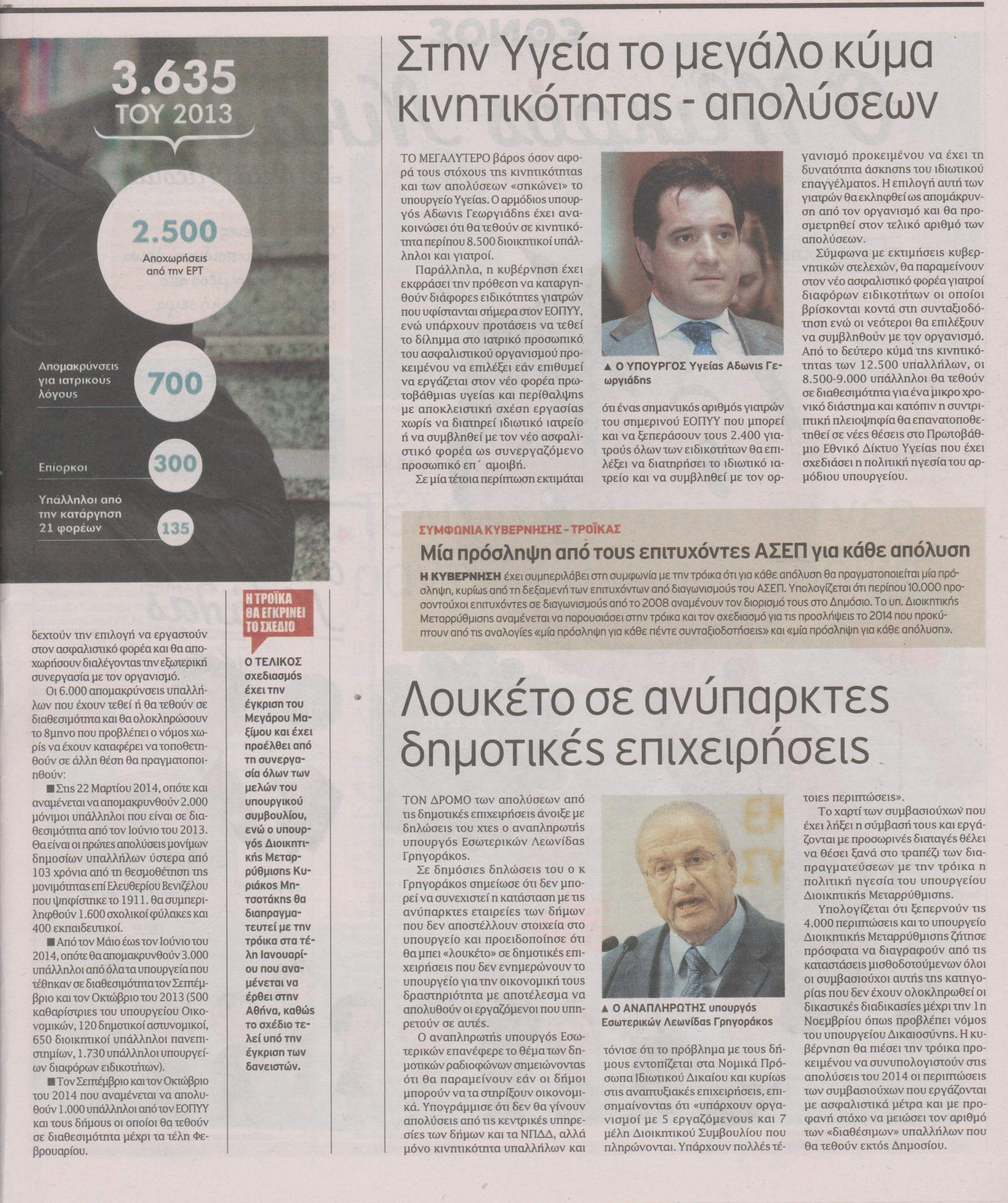 Πεντακόσιοι επίορκοι, 1.000 υπάλληλοι για ιατρικούς λόγους, 1.500 από ΔΕΚΟ και δημοτικές επιχειρήσεις, 2.400 γιατροί του ΕΟΠΥΥ και 6.000 από την «δεξαμενή» της διαθεσιμότητας απομακρύνονται από το Δημόσιο το 2014.