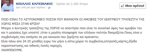 Αιχμές κατά τραπεζίτη αφήνει ο Μιχάλης Καρχιμάκης με σχόλιό του στην προσωπική του ιστοσελίδα στο facebook.Ο γραμματέας του Εθνικού Συμβουλίου του ΠΑΣΟΚ καλεί τον τραπεζίτη να απαντήσει σχετικά με το ποιο είναι το συνολικό ύψος των αμοιβών του, αλλά και για τις μειώσεις που έχει υποστεί.Ο κ. Καρχιμάκης εκτιμά ότι ότι οι μηναίες αποδοχές του συγκεκριμένου τραπεζίτη ανέρχονται στις 24.000-25.000 ευρώ.