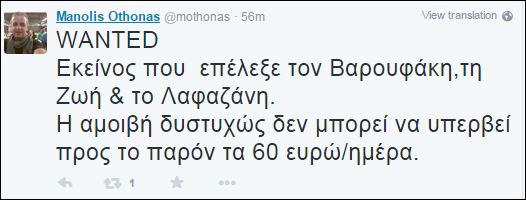 “WANTED Εκείνος που επέλεξε τον Βαρουφάκη,την Ζωή και τον Λαφαζάνη. Η αμοιβή δυστυχώς δεν μπορεί να υπερβεί προς το παρόν τα 60 ευρώ/ημέρα” γράφει ο κ. Όθωνας.