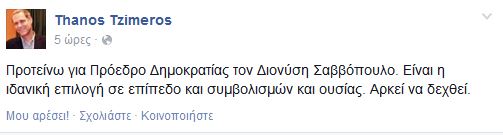 Η ονοματολογία συνεχίζεται ενόψει της εκλογής του Προέδρου της Δημοκρατίας. Toν Διονύση Σαββόπουλο προτείνει από την πλευρά του ο Θάνος Τζήμερος.