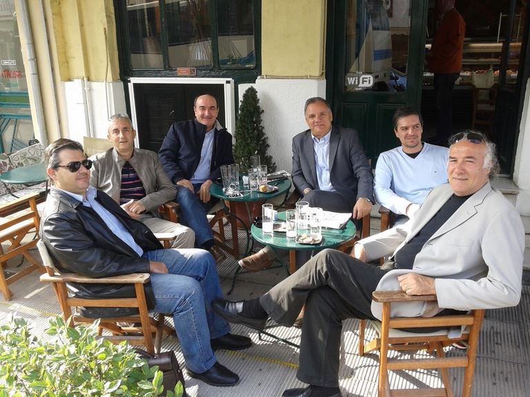 Με την άφιξή του στη πόλη έβγαλε τους φίλους του για ουζάκι στο… ζαχαροπλαστείο του «Μέγα» στην Κονδύλη. Στη φωτογραφία μαζί με τον βουλευτή διακρίνονται, από τα δεξιά, ο τέως αντινομάρχης και συνεργάτης του στη Νομαρχία, Αχιλλέας Αλεξίου, ο επιχειρηματίας Κωνσταντίνος Παπαευθυμίου, ο διευθυντής του πολιτικού γραφείου του βουλευτού Κώστας Ψύχος, ο διοικητής της αστυνομικής φρουράς των Φυλακών Τρικάλων, Γιάννης Γατσάς και ο αντιπρόεδρος της ΝΟΔΕ Τρικάλων, επιτελάρχης του αντιπεριφερειάρχη Γιώργος Καρανάσιος.
