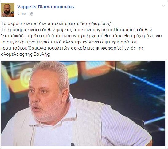 Σφοδρή επίθεση εναντίον του Γρηγόρη Ψαριανού εξαπέλυσε ο Βαγγέλης Διαμαντόπουλος με αφορμή το επεισόδιο που είχε ο βουλευτής του Ποταμιού με την Θεανώ Φωτίου σε τηλεοπτική εκπομπή του Mega. Ο βουλευτής του ΣΥΡΙΖΑ έκανε λόγο για «Κασιδιαρέους» του ακραίου κέντρου και κάλεσε το Ποτάμι να πάρει θέση για το περιστατικό.