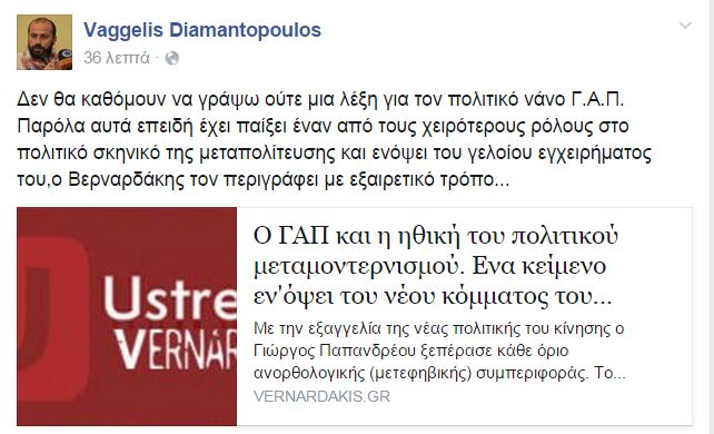 “Δεν θα καθόμουν να γράψω ούτε μια λέξη για τον πολιτικό νάνο Γ.Α.Π.” έγραψε ο βουλευτής του ΣΥΡΙΖΑ Βαγγέλης Διαμαντόπουλος.