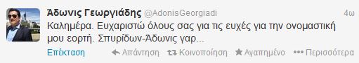 Στους εορτάζοντες ανήκει σήμερα και ο υπουργός Υγείας Άδωνις Γεωργιάδης. Το εξηγεί και ο ίδιος στον προσωπικό του λογαριασμό στο twitter.