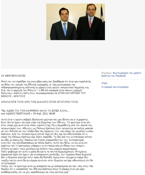 Με τον τίτλο “Οι Φεντεραλιστές” ξεκινάει το κείμενο του Πάνου Καμμένου στο facebook και την φωτογραφία του Άδωνι Γεωργιάδη με τον Αντώνη Σαμαρά.Χαρακτηριστικά γράφει:«Μετά τον αντιπρόεδρο της συγκυβέρνησης που ξεκαθάρισε ότι είναι φεντεραλιστής και θέλει την μείωση της Εθνικής κυριαρχίας, οι νέες μεταγραφές της ποδοσφαιροποιημένης πολιτικής εκ μέρους ενός πρώην πατριωτικού κόμματος της Ν.Δ. που ο αρχηγός του δήλωνε ” η Εθνική κυριαρχία είναι κόκκινη γραμμή” δηλώνουν απόλυτη πίστη στην παγκοσμιοποίηση και ΣΤΗΝ ΚΑΤΑΡΓΗΣΗ ΤΟΥ ΕΘΝΟΥΣ – ΚΡΑΤΟΥΣ».«ΑΠΟΛΑΥΣΤΕ ΤΟΥΣ ΑΠΟ ΤΟΝ ΔΙΑΛΟΓΟ ΣΤΟΝ ΙΣΤΟΤΟΠΟ ΤΟΥΣ»