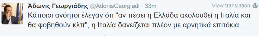 «Κάποιοι ανόητοι έλεγαν ότι “αν πέσει η Ελλάδα ακολουθεί η Ιταλία και θα φοβηθούν κλπ”, η Ιταλία δανείζεται πλέον με αρνητικά επιτόκια…» έγραψε ο κ. Γεωργιάδης.