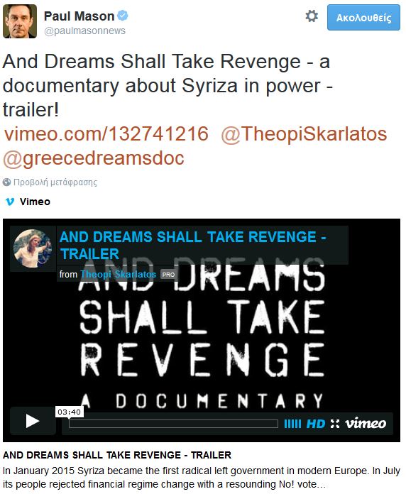 «Οι κάμερές ήταν εκεί, από την πρώτη προεκλογική συγκέντρωση έως τη σύσταση της κυβέρνησης, τη νύχτα του δημοψηφίσματος και ακόμα γυρίζουμε. «Και τα όνειρα θα πάρουν εκδίκηση» είναι ένα μεγάλου μήκους ντοκιμαντέρ καταγράφοντας την ιστορία της πορείας της βάσης του ΣΥΡΙΖΑ -από τα βουνά της Κορίνθου έως τις προβλήτες του Πειραιά και τις εργατογειτονιές της Αθήνας».