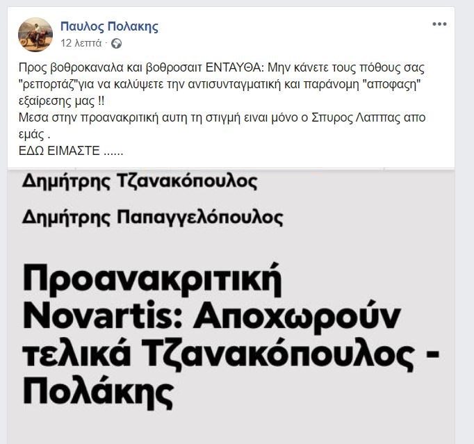 «Προς βοθροκάναλα και βοθροσάιτ ενταύθα: Μην κάνετε τους πόθους σας “ρεπορτάζ” για να καλύψετε την αντισυνταγματική και παράνομη “απόφαση” εξαίρεσης μας», αναφέρει σε ανάρτηση του στο Facebook ο Παύλος Πολάκης από τη Βουλή που βρίσκεται. «Μέσα στην προανακριτική αυτή τη στιγμή είναι μόνο ο Σπύρος Λάππας από εμάς», προσθέτει ο κ. Πολάκης στην ανάρτηση που έκανε και καταλήγει ως εξής: «Εδώ είμαστε…»