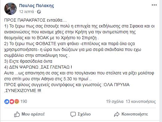 Μέσω Facebook, τοποθετήθηκε ο αναπληρωτής Υπουργός Υγείας Παύλος Πολάκης, για την μολότοφ που έριξε άγνωστος, το πρωί, στην πολυκατοικία που διαμένει. Γράφει ο κ. Πολάκης: ΠΡΟΣ ΠΑΡΑΚΡΑΤΟΣ ενταύθα….1) Το ξέρω πως σας έτσουξε πολύ η επιτυχία της εκδήλωσης στα Σφακιά και οι ανακοινώσεις που κάναμε χθες στην Κρήτη για την αντιμετώπιση της θεομηνίας και το ΒΟΑΚ με το Χρήστο το Σπίρτζη .2) Το ξέρω πως ΦΟΒΑΣΤΕ γιατί φτάνει -επιτέλους και παρά όλα όσα χρησιμοποιήσατε- η ώρα των διώξεων για μια σειρά σκάνδαλα που έχω συμβάλλει στην αποκάλυψη τους .3) Είστε θρασύδειλα όντα 4) ΔΕΝ ΨΑΡΩΝΩ ,ΣΑΣ ΓΛΕΝΤΑΩ !Αυτά …ως απάντηση σε σας και στο τσογλανάκι που στείλατε να ρίξει μολότοφ στο σπίτι μου στην Αθήνα στις 5.30 το πρωί ..ΠΡΟΣ φίλους συγγενείς συντρόφους και γνωστούς :ΟΛΑ ΠΡΥΜΑ ,ΣΥΝΕΧΙΖΟΥΜΕ !!!