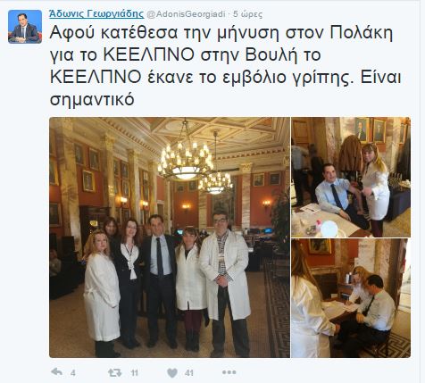 «Η Βουλή των Ελλήνων, ανταποκρινόμενη στην πρόταση του ΚΕΕΛΠΝΟ για συμμετοχή της στην εκστρατεία του Κέντρου για την ενίσχυση του αντιγριπικού εμβολιασμού, θα υποδεχθεί ειδικό συνεργείο το οποίο θα εμβολιάσει προαιρετικά μέλη του Κοινοβουλίου, πρώην Βουλευτές, Ευρωβουλευτές καθώς και υπαλλήλους της Βουλής.