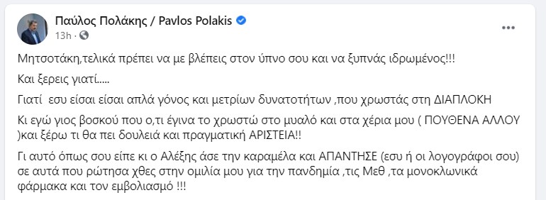 “Μητσοτάκη, τελικά πρέπει να με βλέπεις στον ύπνο σου και να ξυπνάς ιδρωμένος!!! Και ξέρεις γιατί….. Γιατί εσύ είσαι είσαι απλά γόνος και μετρίων δυνατοτήτων ,που χρωστάς στη ΔΙΑΠΛΟΚΗ. Κι εγώ γιος βοσκού που ό,τι έγινα το χρωστώ στο μυαλό και στα χέρια μου ( ΠΟΥΘΕΝΑ ΑΛΛΟΥ )και ξέρω τι θα πει δουλειά και πραγματική ΑΡΙΣΤΕΙΑ!! Γι αυτό όπως σου είπε κι ο Αλέξης άσε την καραμέλα και ΑΠΑΝΤΗΣΕ (εσύ ή οι λογογράφοι σου) σε αυτά που ρώτησα χθες στην ομιλία μου για την πανδημία ,τις ΜΕΘ ,τα μονοκλωνικά φάρμακα και τον εμβολιασμό !!!” έγραψε χαρακτηριστικά σε ανάρτησή του στο Facebook.