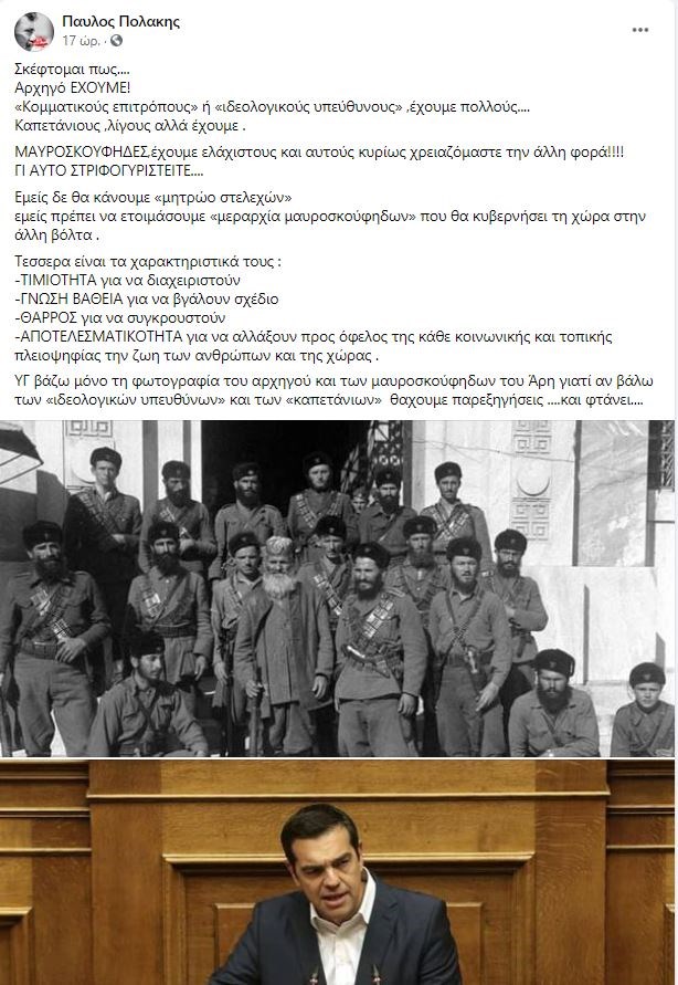 Σε ανάρτησή του στο Facebook o Παύλος Πολάκης αναφερόμενος στα εσωκομματικά του ΣΥΡΙΖΑ ανέφερε ότι στο κόμμα πρέπει να ετοιμαστεί «μεραρχία μαυροσκουφήδων». Συγκεκριμένα, ο πρώην αναπληρωτής υπουργός Υγείας ανέφερε μεταξύ άλλων ότι «Αρχηγό έχουμε», ιδεολογικούς υπεύθυνους έχουμε πολλούς, καπετάνιους λίγους αλλά έχουμε, μαυροσκούφηδες χρειαζόμαστε για την άλλη φορά!», προσθέτοντας ότι «πρέπει να ετοιμάσουμε “μεραρχία μαυροσκούφηδων” που θα κυβερνήσει τη χώρα στην άλλη βόλτα».