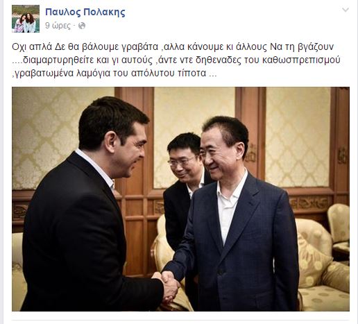 Το γεγονός ότι ο Πρωθυπουργός της Κίνας Λι Κετσιάνγκ δεν φόρεσε γραβάτα, στη συνάντηση του με τον Αλέξη Τσίπρα, ακολουθώντας τις ενδυματολογικές επιλογές του Έλληνα Πρωθυπουργού, σχολίασε ο Παύλος Πολάκης.