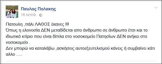 Με ανάρτησή του στο Facebook ο Παύλος Πολάκης απαντά στην ΚΕΔΕ και τον πρόεδρο της Γιώργο Πατούλη, που ζητούν την άμεση παρέμβαση της ηγεσίας του υπουργείου Υγείας για τις συνθήκες στο γενικό νοσοκομείο Πατησίων. Αφορμή αποτέλεσε η δημοσίευση στο «vimaonline» σχετικής έκθεσης των Επιθεωρητών Δημόσιας Υγείας, στην οποία γίνεται λόγος για «Νταχάου προσφύγων» και «υγειονομική βόμβα» στο κέντρο της Αθήνας.