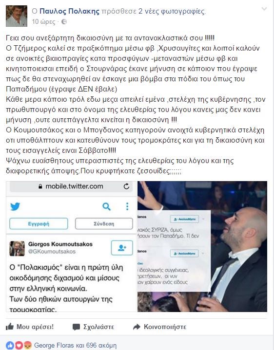 Παρέμβαση μέσω Facebook έκανε ο αναπληρωτής υπουργός Υγείας Παύλος Πολάκης, με αφορμή την εισαγγελική παρέμβαση για τις αναρτήσεις κατά του Γιάννη Στουρνάρα και ειδικά για την ανάρτηση του Γιώργου Φιλιππάκη.