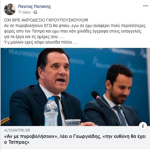 Η Νέα Δημοκρατία κατηγορεί την κυβέρνηση ως ηθική αυτουργό για την βομβιστική επίθεση στον Σκάϊ και ο αντιπρόεδρος του κόμματος Αδωνις Γεωργιάδης ανέφερε χθες «αν με πυροβολήσουν θα έχει ευθύνη ο Τσίπρας;».Ο αναπληρωτής υπουργός Υγείας κ. Πολάκης… άδραξε την ευκαιρία και του απάντησε μέσω Facebook: «Όχι βρε ακροδεξιό γκρουπόσκυλο!!! Αν σε πυροβολήσουν ΕΓΩ θα φταίω ,εγώ σε έχω αναφέρει πολύ περισσότερες φορές από τον Τσίπρα και έχω πάει κάτι χιλιάδες έγγραφα στους εισαγγελείς για τα έργα και τις ημέρες σου ….Υ.γ Μάλλον έχεις κόψει αλυσίδα πλέον…..»
