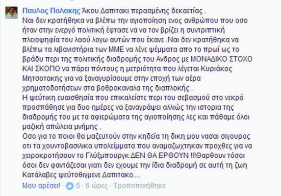 «Είσαι υπουργός, πάνω σου εναποτίθενται οι ελπίδες του λαού για σημαντικές, ψύχραιμες αποφάσεις. Δεν κρατήθηκες. Είσαι πολιτικός. Διδάσκεις ήθος. Δεν κρατήθηκες. Είσαι άνθρωπος. Θρώσκεις, κάποια στιγμή θα αποδημήσεις κι εσύ. Αλλά όχι. Στην κηδεία δεν κρατήθηκες ούτε μια ημέρα. Οχι για την πολιτική του άποψη. Για την ανθρώπινη εκδήλωση αυτής απέναντι στο πένθος του θανάτου. Ντροπή σου Πολάκη, είσαι πολύ μικρός. Στη δική σου ώρα να δω πόσοι θα ασχοληθούμε και με ποιο τρόπο», έγραψε ο πολίτης με τον αναπληρωτή υπουργό Υγείας να απαντά με ύβρεις σπεύδοντας, μάλιστα, να τον χαρακτηρίσει και μέλος της ΔΑΠ.