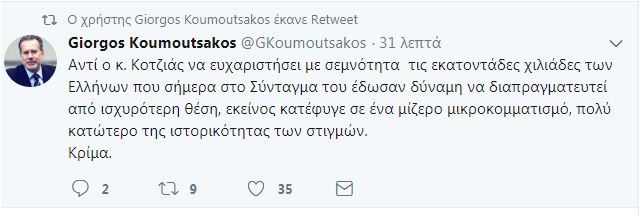 Ο τομεάρχης Εξωτερικών και βουλευτής της ΝΔ Γιώργος Κουμουτσάκος, σχολιάζοντας την τοποθέτηση του υπουργού Εξωτερικών Ν. Κοτζιά για το συλλαλητήριο, έκανε στο λογαριασμό του στο Twitter την εξής ανάρτηση: